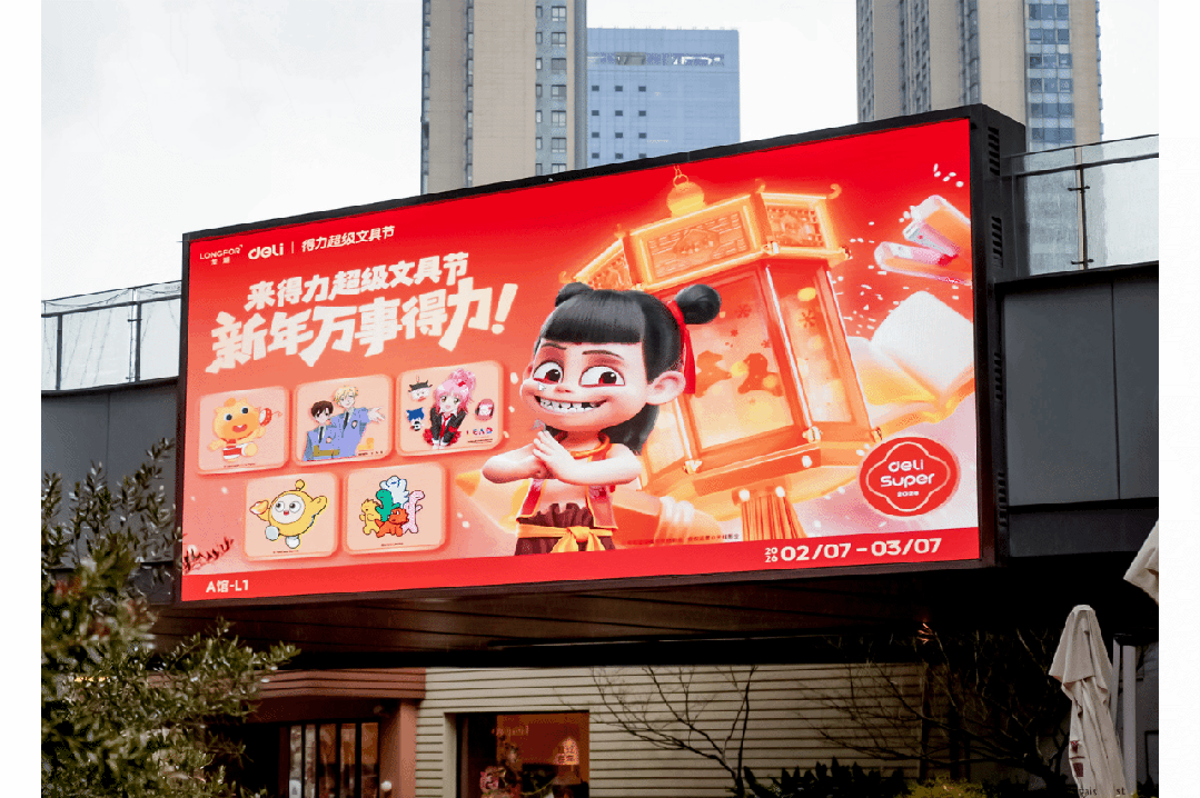 夜幕降临,商圈华灯初上,得力超级文具节的花式装置成为一道独特的风景线,将新春的喜庆氛围与品牌的年轻活力交织在一起,吸引着络绎不绝的家庭与年轻客群前来“逛节”。电子屏、吊旗、灯箱等商圈关键媒介被统一调动,文具节的主视觉高频出现于城市公共空间之中。