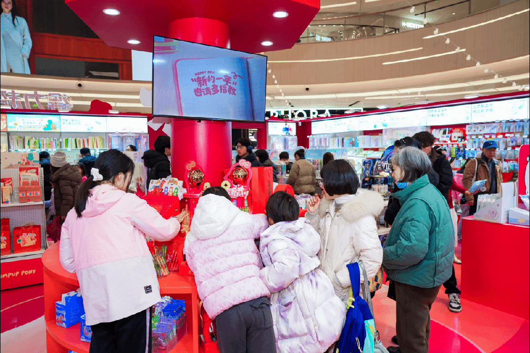 这场线下盛宴的魅力,远不止于逛逛而已。一系列互动玩法,让每位到场者都能沉浸其中,非遗“妙笔糖画”、“天选之子”、IP合影、好运头条拍照机等互动机制,不断制造高密度的体验点与内容素材。尤其值得一提的是,现场特别设置了新春主题的印章祈福互动,消费者可盖印“学业得力”“金榜题名”等寓意吉祥的新春印章,简单又有仪式感,既增添了游园玩乐的趣味,也将新年美好祝愿自然融入互动体验之中。